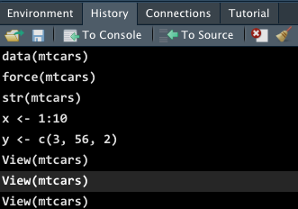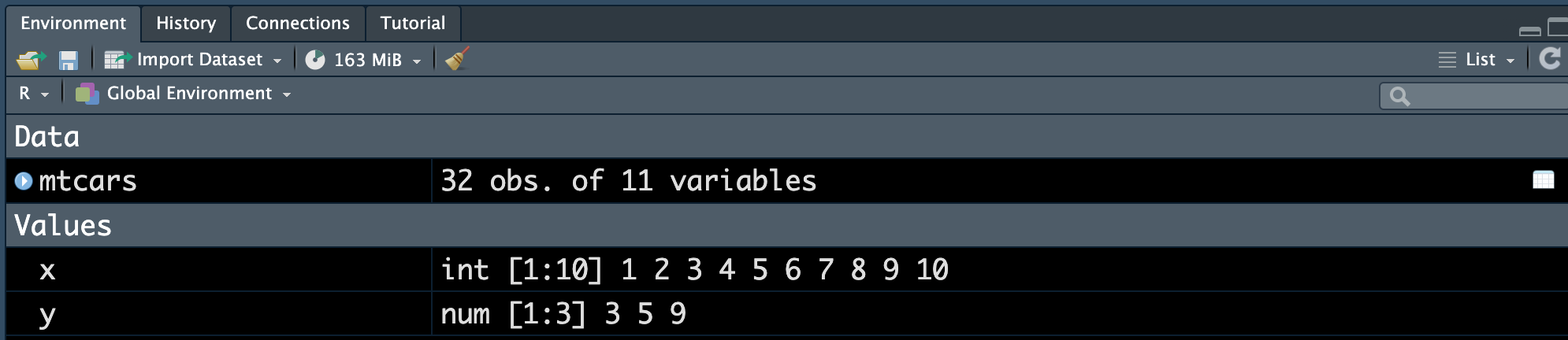 ctrl + enter (Win) or cmd + enter (Mac)alt + ctrl + p (Win) or option + cmd + p (Mac)shift + ctrl + s (Win) or shift + cmd + s (Mac)shift + ctrl + enter (Win) or shift + cmd + enter (Mac)The (global) environment is where we are currently working.