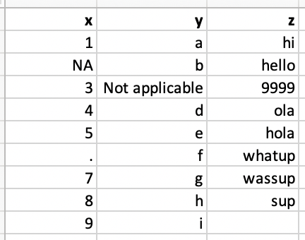 read_csv() only recognizes ” “ and NA as a missing value.na.read_csv("./data/df-na.csv",