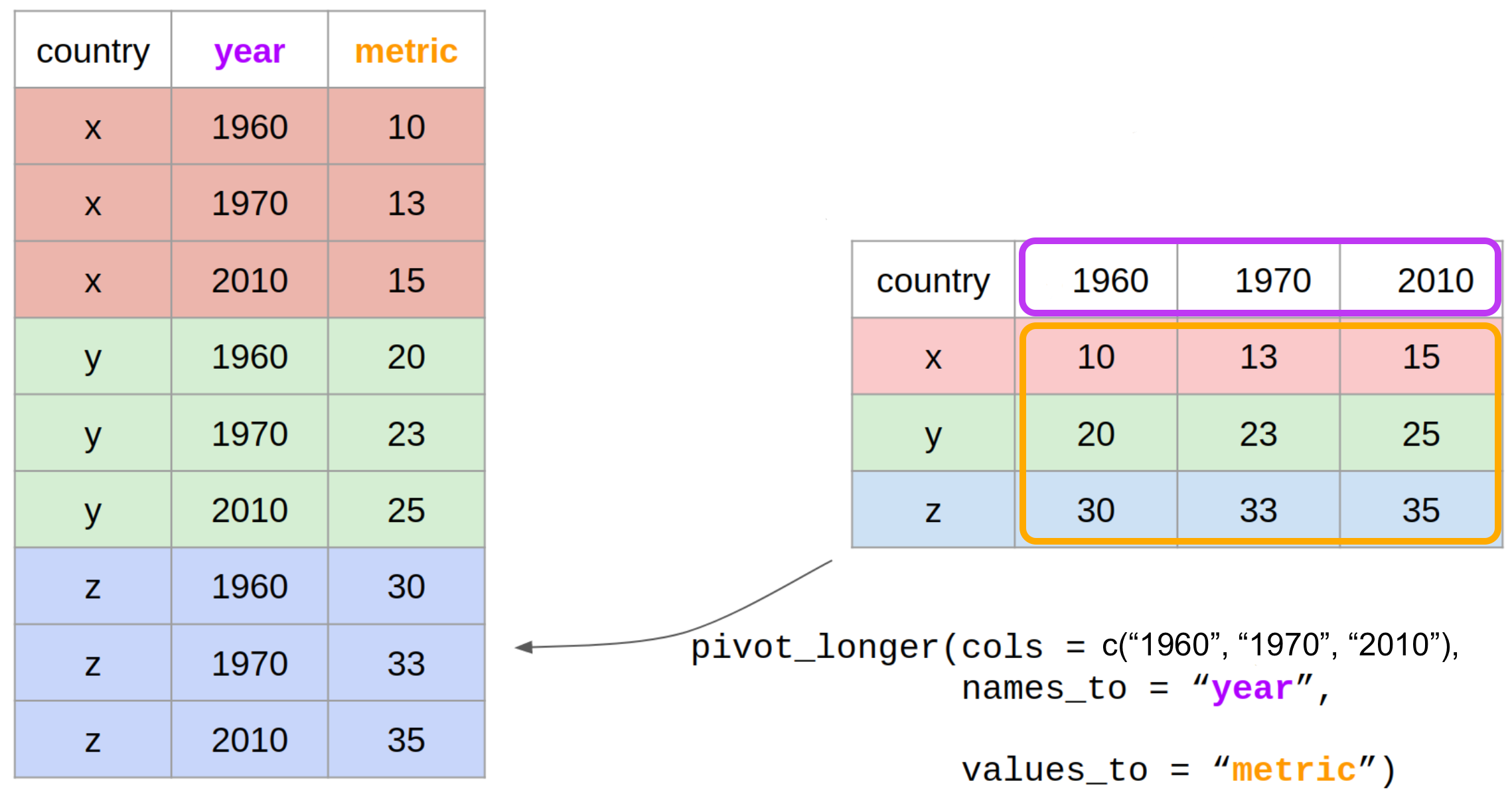 pivot_longer() ``lengthens” data, adding more rows and decreasing the number of columns.