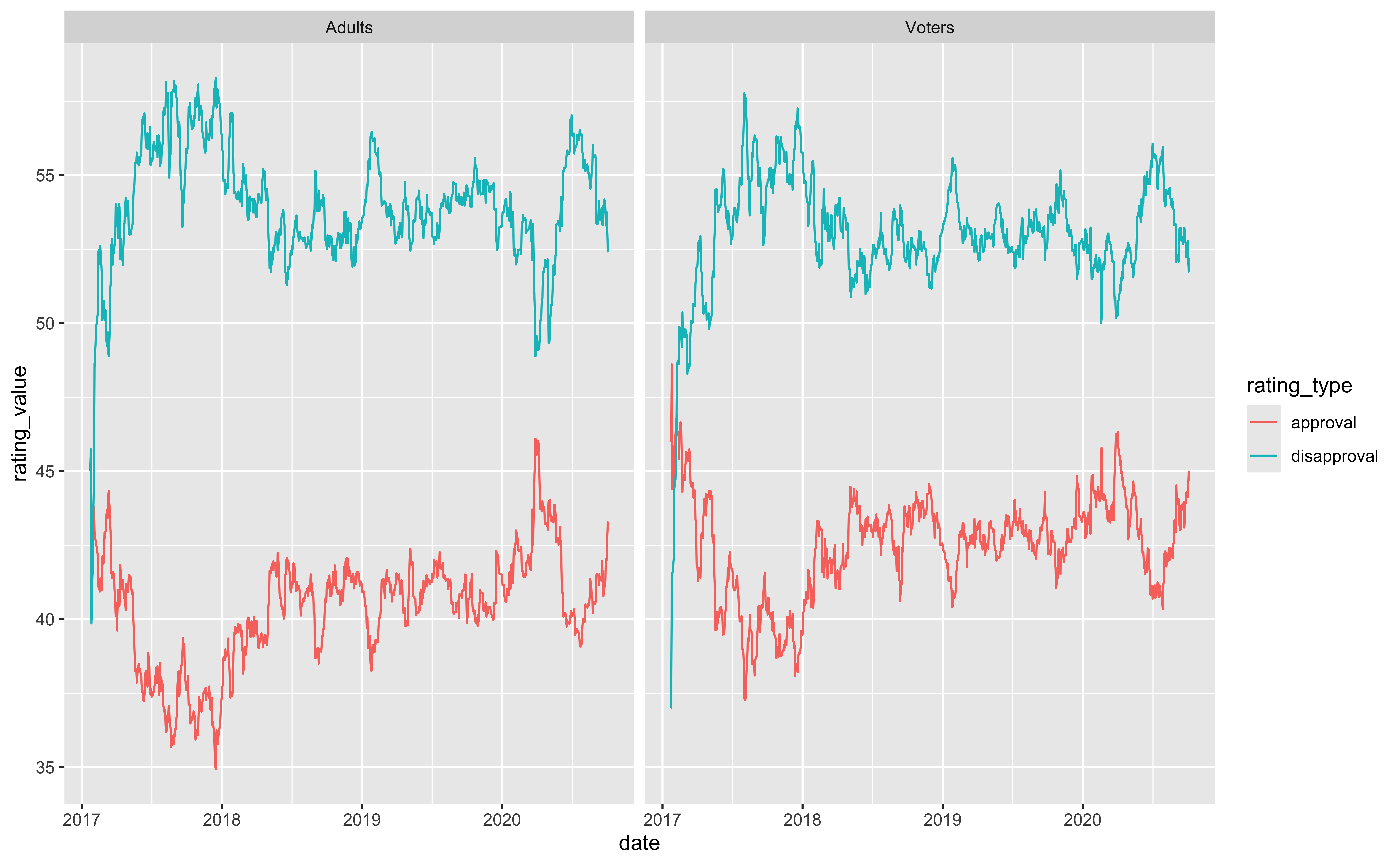 Use pivot_longer() to transform trump_data into the data set trump_longer on the right.