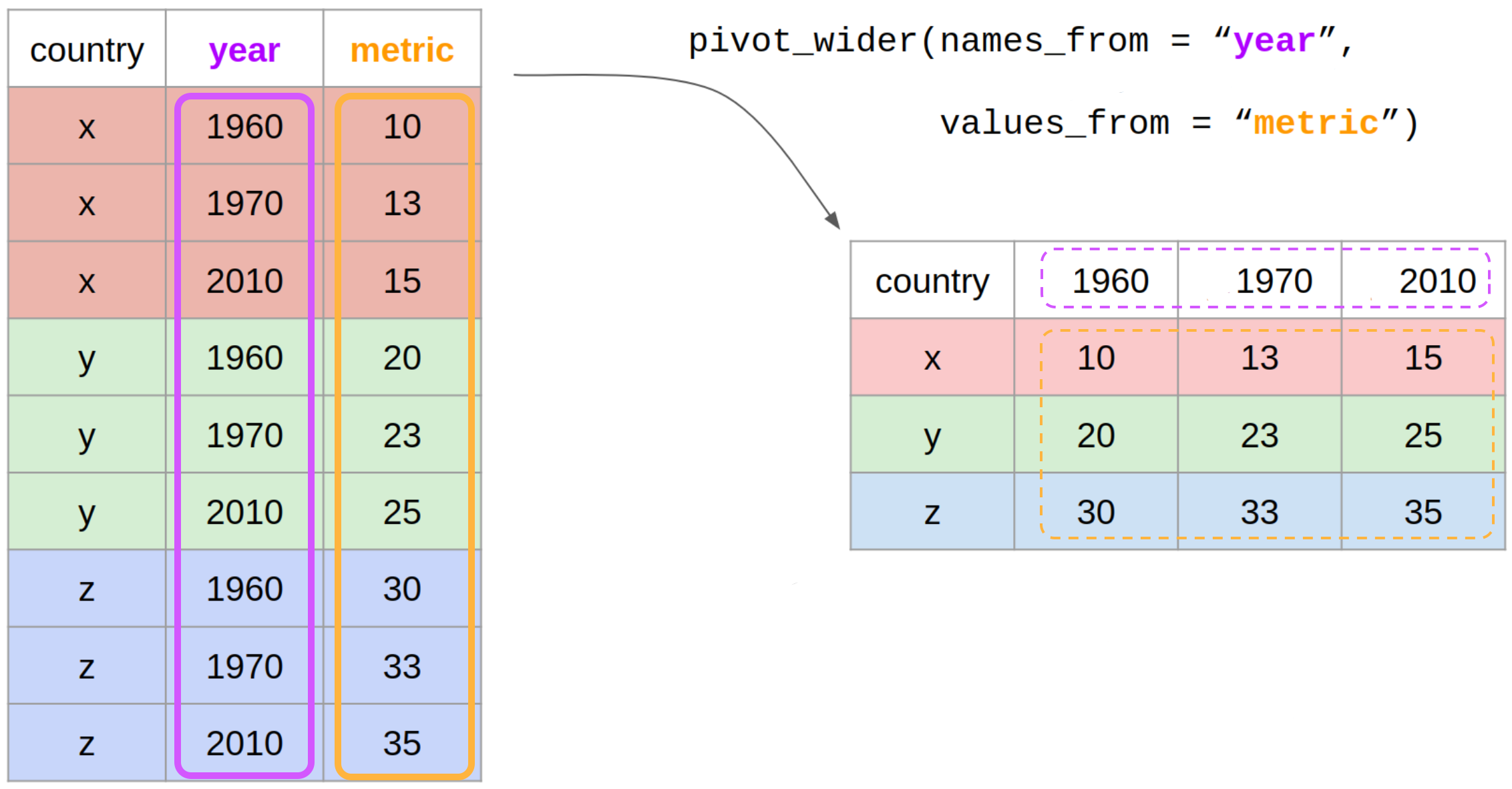 names_from: which column variable in the long format contains the what should be column names in the wide format (year)
