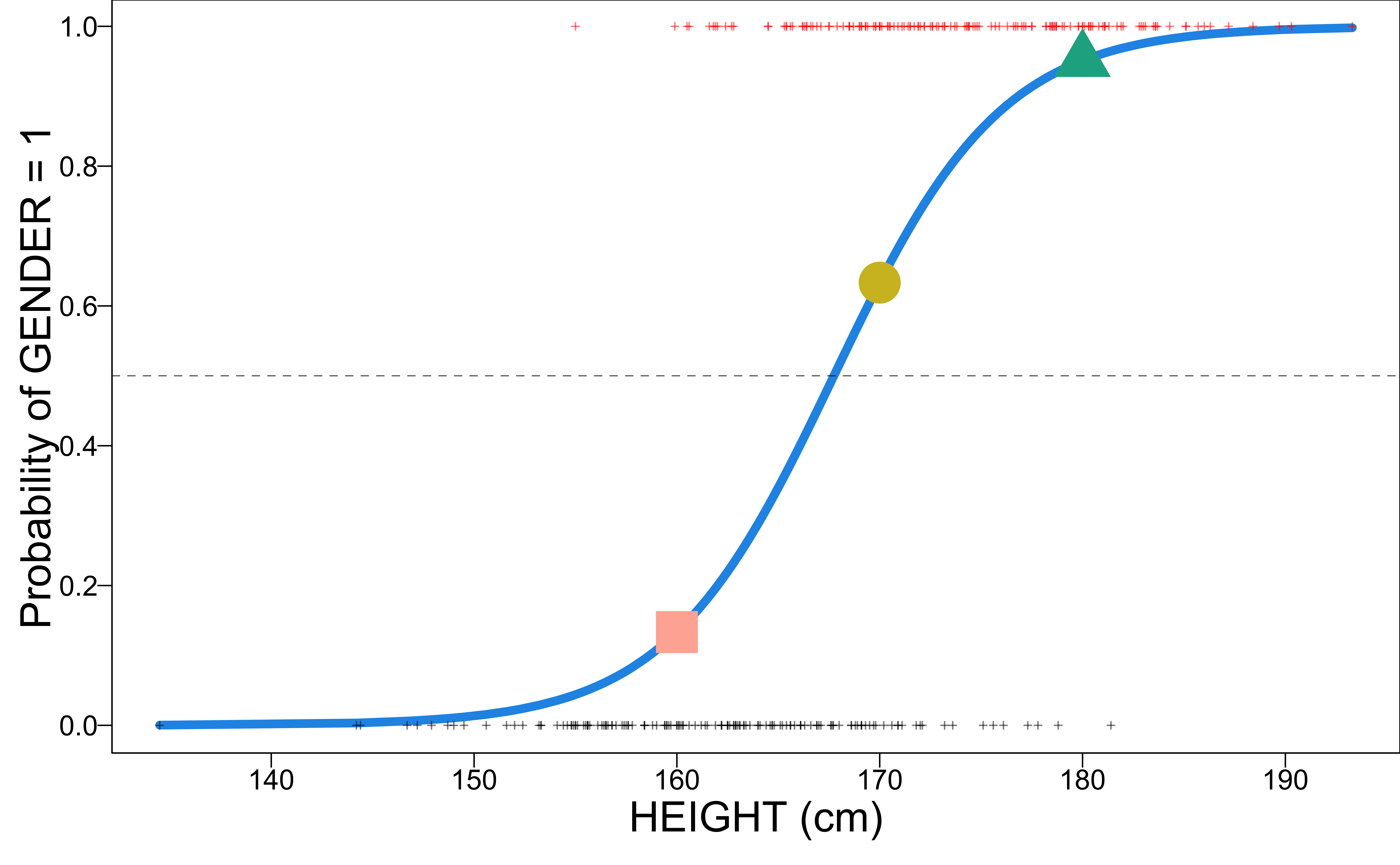 \[ \hat{\pi}(x = 170) = \frac{1}{1+\exp(-\hat{\beta}_0-\hat{\beta}_1 x)} = \frac{1}{1+\exp(-(-40.55) - 0.24 \times 170)} = 63.3\%\]