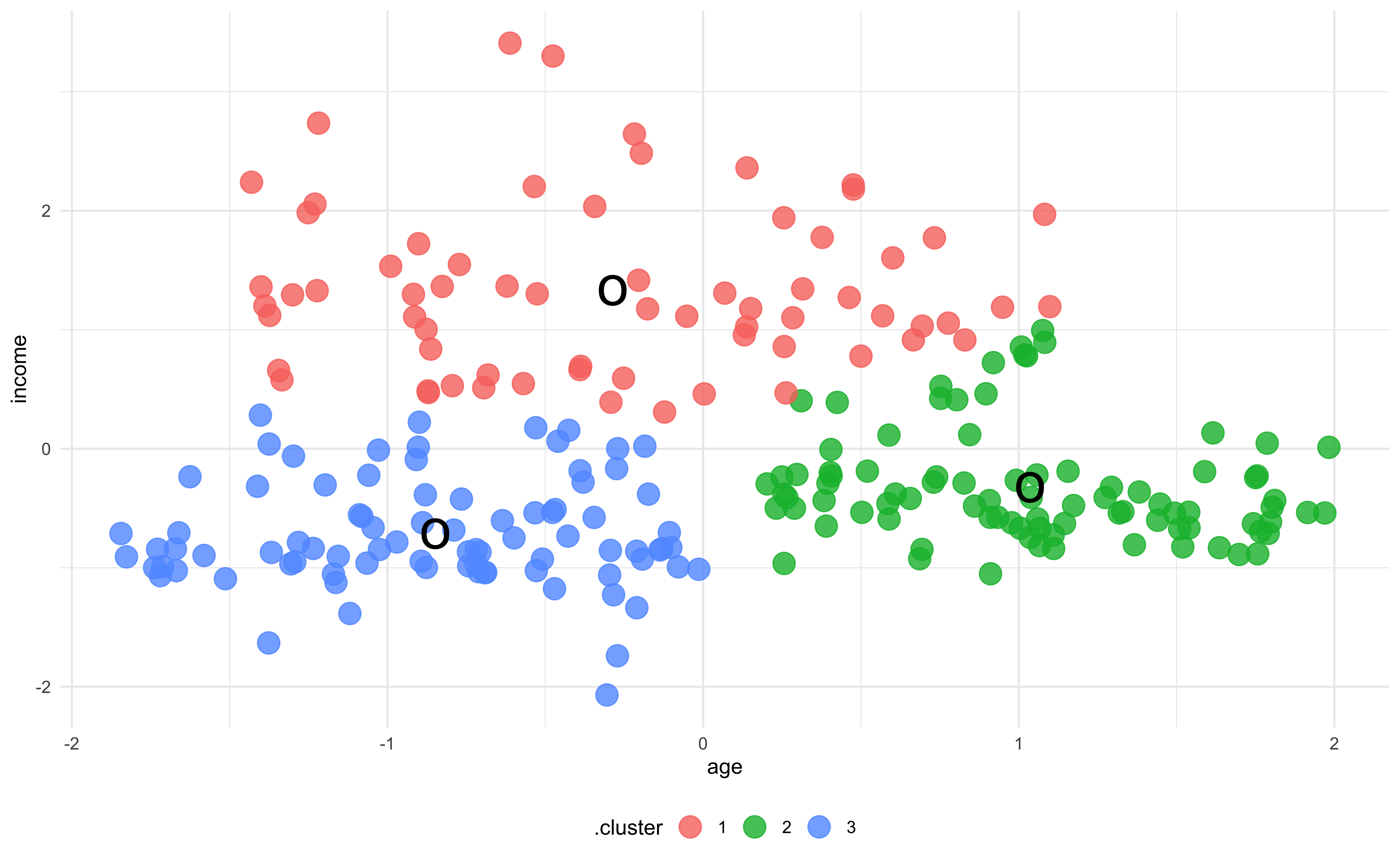 geom_point()kmeans()K-means clustering with 3 clusters of sizes 67, 88, 85